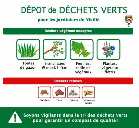 L’entretien des jardins des particuliers produit des déchets verts. Pour les habitants de Maillé, et pour leurs seuls jardins situés sur la commune, nous proposons la possibilité de déposer, exclusivement, les tontes de gazon, les branchages d’un diamètre maximum de 10 cm, des feuilles, des résidus de taille de végétaux, des plantes et végétaux flétris, sur le terrain communal situé à proximité du carrefour de la RD158 et la RD91 et à proximité des containers d’apport volontaire de verre et de papier.